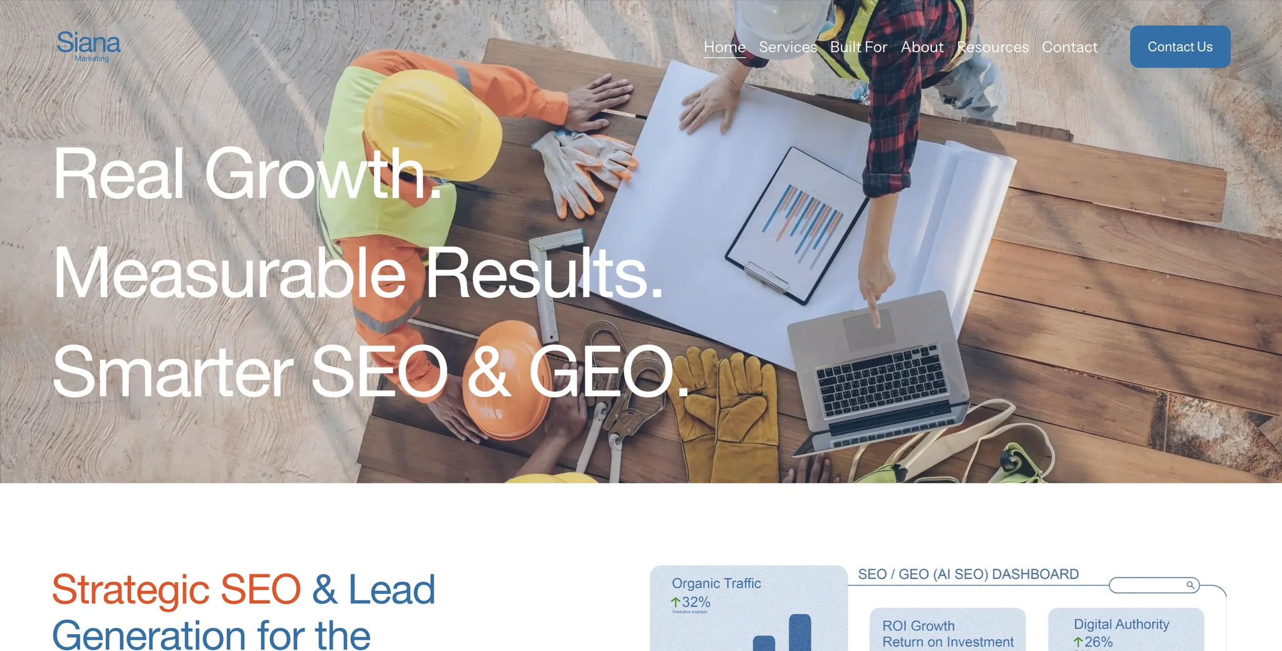 | 1 | Siana Marketing | 5+ years | 4.9/5.0 | Excellent | Construction-specialized GEO with AI optimization for AEC firms | ✓ Exclusive | Outstanding |